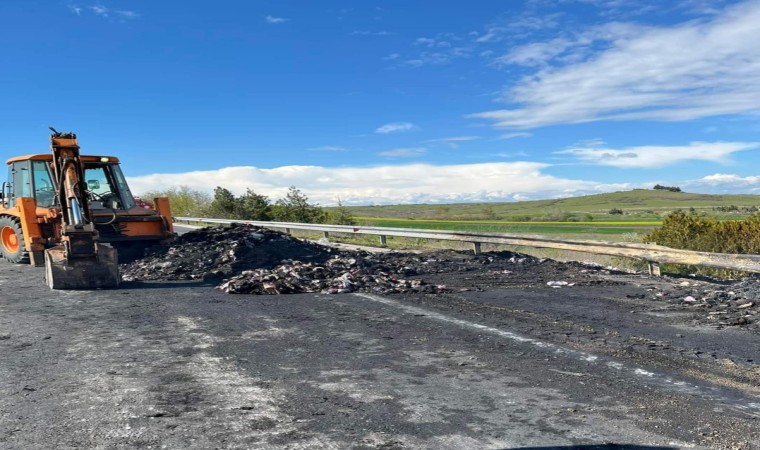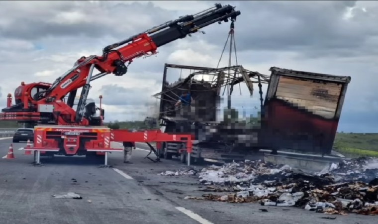 İstanbul-Edirne Otoyolu’nda seyir halindeki kumaş yüklü tır, Kırklareli’nin Babaeski ilçesi yakınlarında yanarak küle döndü.