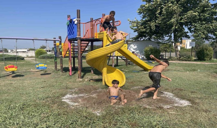 Türkiye’nin en sıcak illerinin başında gelen Osmaniye’de sıcak hava yaşamı olumsuz etkiliyor. Osmaniye’nin Dumlupınar mahallesinde bulunan Şehit Hüseyin Şahin Parkında sıcak havadan bunalan çocuklar, oyun parkını aqua parka çevirdi. Parkın içerisinde bulunan su hortumunu kaydırağa koyarak hem serinleyen hem eğlenen çocuklar keyifli anlar yaşadı.