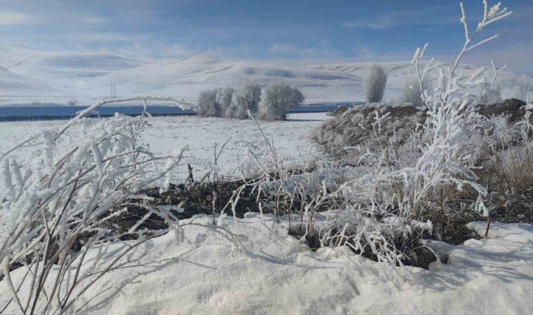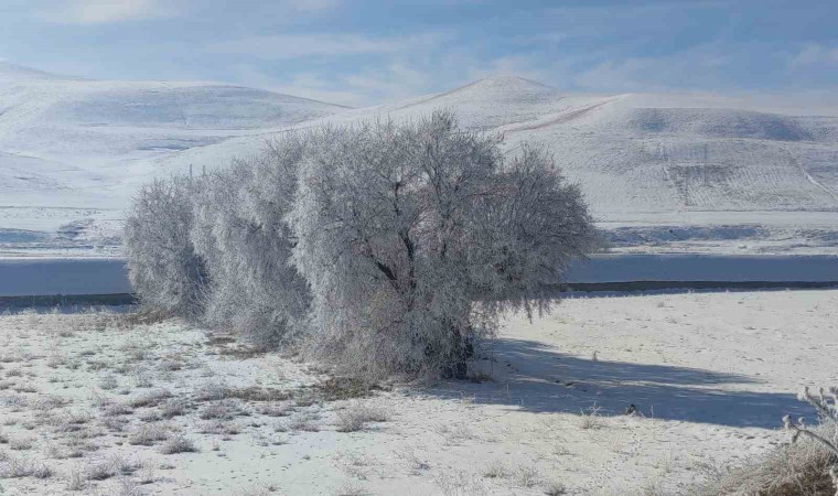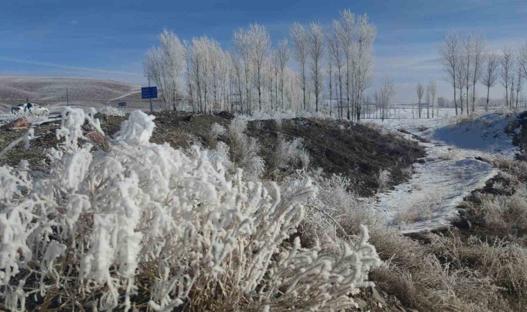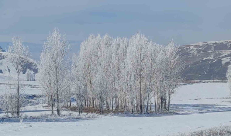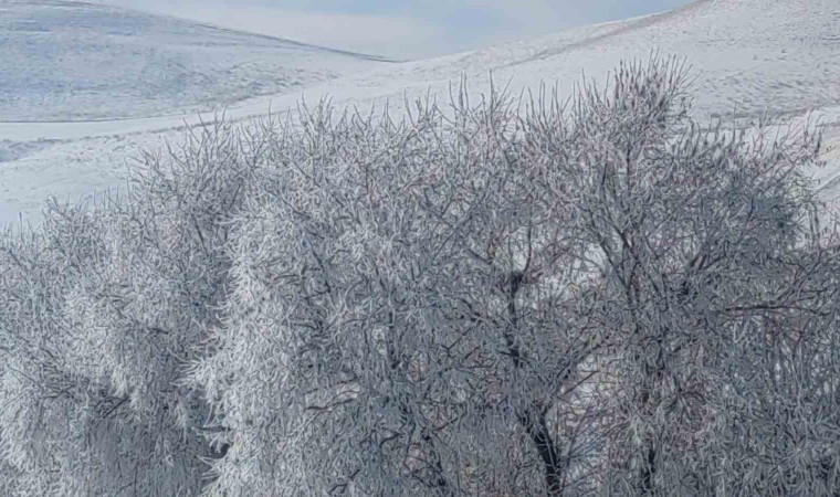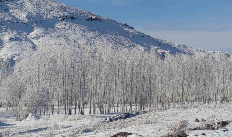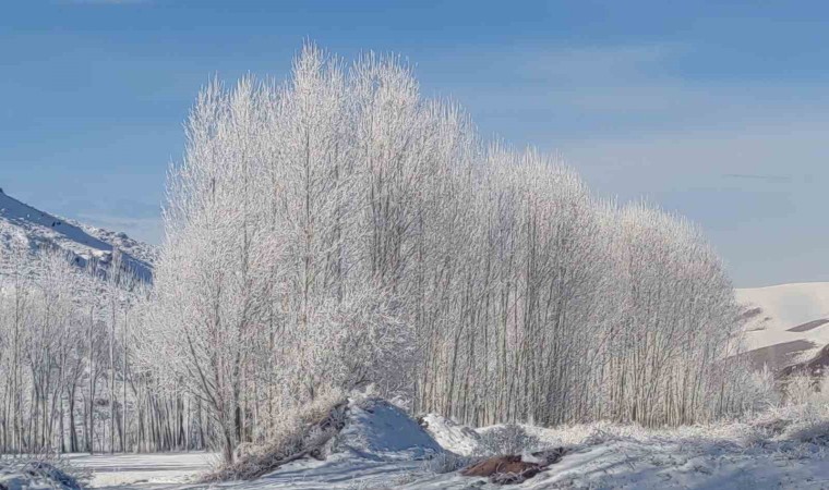 Van’ın Özalp ilçesinde dondurucu soğuklar hayatı olumsuz etkilerken kırağı tutan ağaçlar kartpostallık görüntüler oluşturdu.