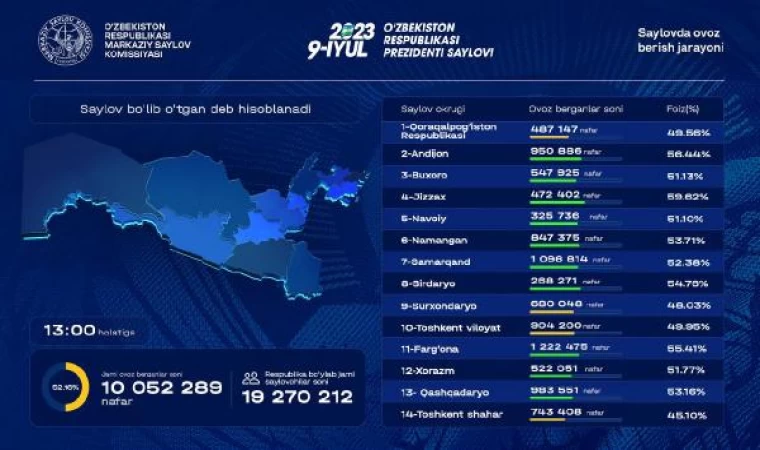 Özbekistan Merkezi Seçim Kurumu, bugün yerel saatle 13.00 itibarıyla kullanılan oy sayısını açıkladı ve bu rakamın 10 milyon 52 bin 289 olduğunu duyurdu. Bu sonuçla birlikte seçmenlerin yüzde 52.16'si oy kullanmış oldu.