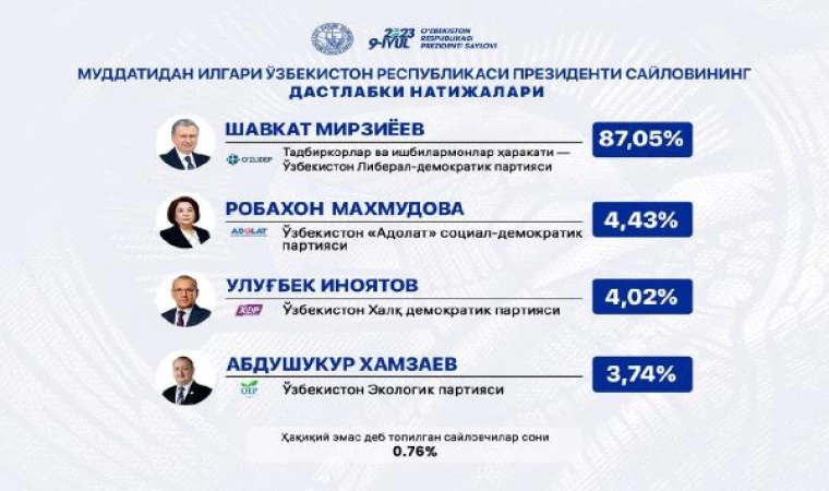 Özbekistan Merkezi Seçim Kurumu tarafından açıklanan ön sonuçlara göre, Özbekistan Liberal Demokrat Partisi adayı olan Mirziyoyev, büyük bir destekle cumhurbaşkanlığını sürdürmeye hak kazandı. Diğer adayların aldığı oy oranları ise şu şekilde gerçekleşti: Adalet Sosyal Demokrat Partisi adayı Roba Mahmudova yüzde 4,43, Halk Demokrat Partisi lideri Uluğbek Inoyatov yüzde 4,02 ve Özbekistan Ekoloji Partisi adayı Abduşukur Hamzayev yüzde 3,74.