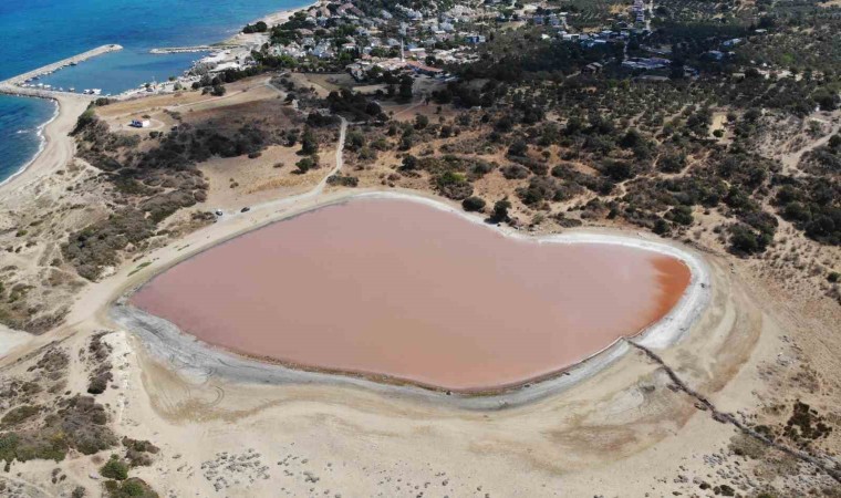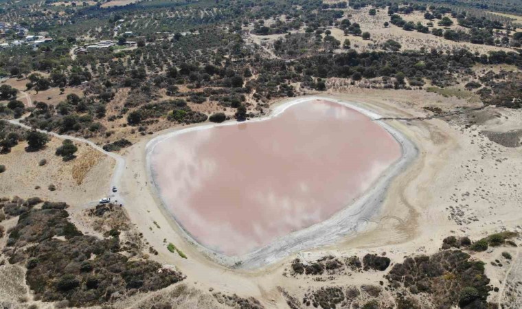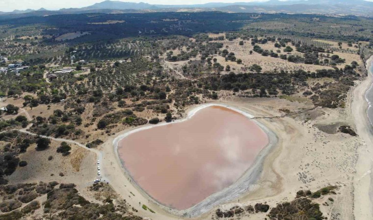 Çanakkale’nin Ezine ilçesine bağlı Dalyan köyündeki Alexandria Troas Antik Kenti’nin 2 bin yıllık iç limanı, zamanla denizle bağlantısı kesilince, doğa koşullarına bağlı olarak kalp şeklini aldı. İçerisindeki tuzlu su da yılın belli dönemlerinde pembe renge dönüşünce ortaya kalpli pembe göl çıktı. Bugünlerde yeniden pembeleşmeye başlayan kalp şeklindeki göl, ziyaretçilerin ilgisini çekiyor. Pembeye bürünen ve kalp şekli ile dikkati çeken ’Kalpli Göl’, dron ile havadan görüntülendi.