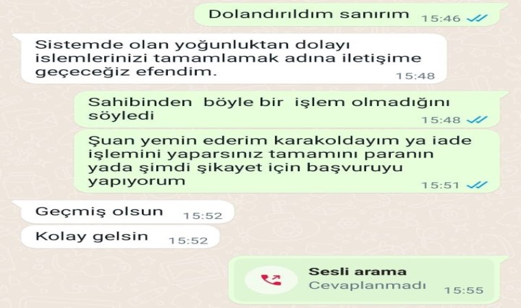 Yaşanan olayda dolandırıldığını fark eden bir mağdur “Dolandırıldım sanırım” mesajı attı. Mağdura cevap olarak “Sistemde olan yoğunluktan dolayı işlemlerimizi tamamlamak adına iletişime geçeceğiz efendim” yazan dolandırıcılara “Şu an yemin ederim karakoldayım ya iade işlemi yaparsınız tamamını paranın ya da şimdi şikayet için başvuru yapıyorum” mesajı üzerine dolandırıcılar alay eder gibi “Geçmiş olsun. Kolay gelsin” yazdı.