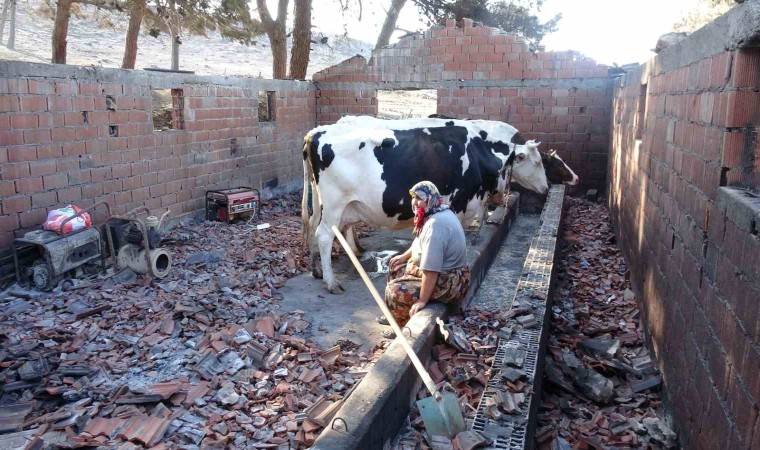 Çanakkale merkeze bağlı Kızılkeçili köyünde 16 Temmuz Pazar günü çıkan orman yangını 52 saat sonra kontrol altına alındı. Yangın sırasında, köylerden Kemel’de hayvancılık yapan Ali Tüfekçi’nin büyükbaş hayvan damı da yandı. İneklerinin sütünü alışkın oldukları hayvan damından başka bir yerde sağamadığını söyleyen Tüfekçi, sabah saatlerinde hayvanlarını yanan dama getirerek, burada süt sağma işlemini gerçekleştirdi.