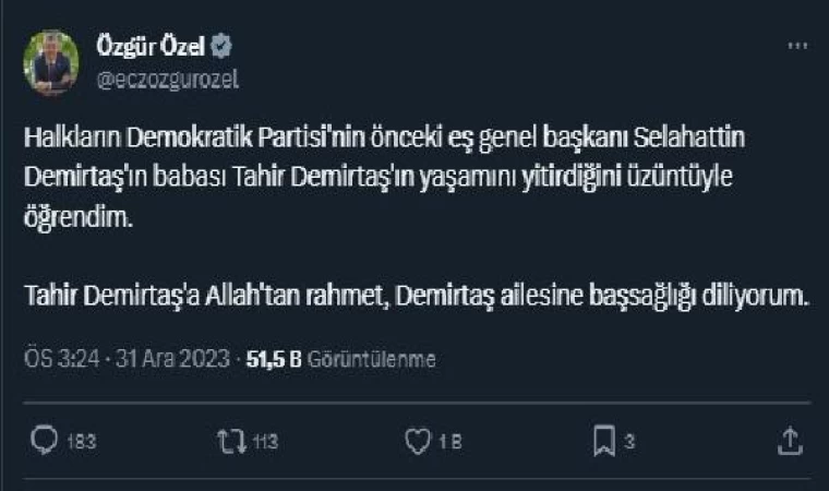 Özel, sosyal medya hesabından yaptığı paylaşımda, "Halkların Demokratik Partisi'nin önceki Eş Genel Başkanı Selahattin Demirtaş'ın babası Tahir Demirtaş'ın yaşamını yitirdiğini üzüntüyle öğrendim. Tahir Demirtaş'a Allah'tan rahmet, Demirtaş ailesine başsağlığı diliyorum" dedi. (DHA)