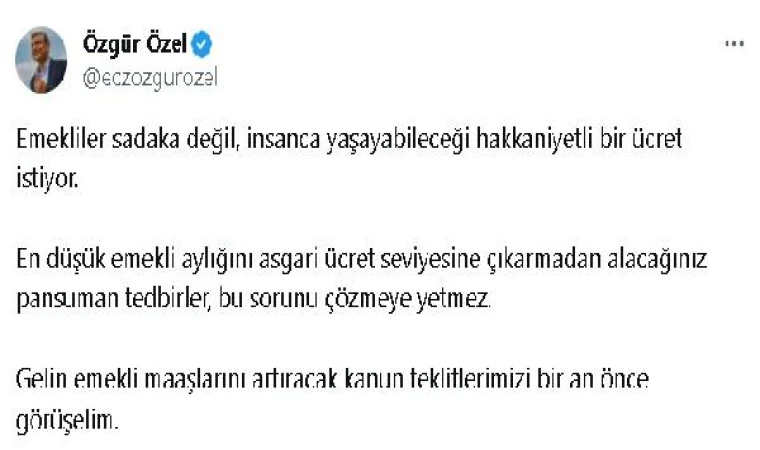 Özel, Cumhurbaşkanı Recep Tayyip Erdoğan'ın Kabine Toplantısı sonrası yaptığı açıklamada emeklilere bir defaya mahsus olmak üzere 5 bin TL ödeme yapılacağını duyurmasının ardından sosyal medya hesabından açıklama yaptı. Özel, "Emekliler sadaka değil, insanca yaşayabileceği hakkaniyetli bir ücret istiyor. En düşük emekli aylığını asgari ücret seviyesine çıkarmadan alacağınız pansuman tedbirler, bu sorunu çözmeye yetmez. Gelin emekli maaşlarını artıracak kanun tekliflerimizi bir an önce görüşelim" dedi. (DHA)