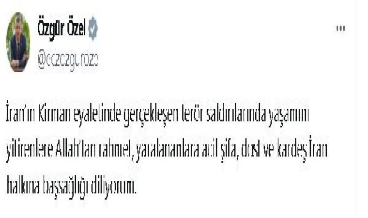 ANKARA, (DHA)- CHP Genel Başkanı Özgür Özel, İran’daki bombalı terör saldırısına ilişkin, sosyal medya hesabından taziye mesajı yayınladı.