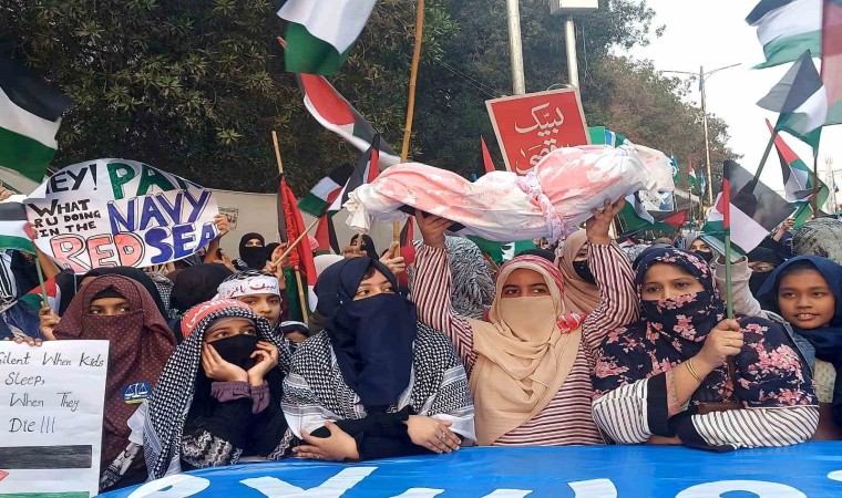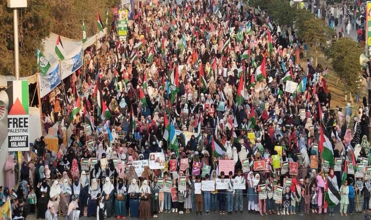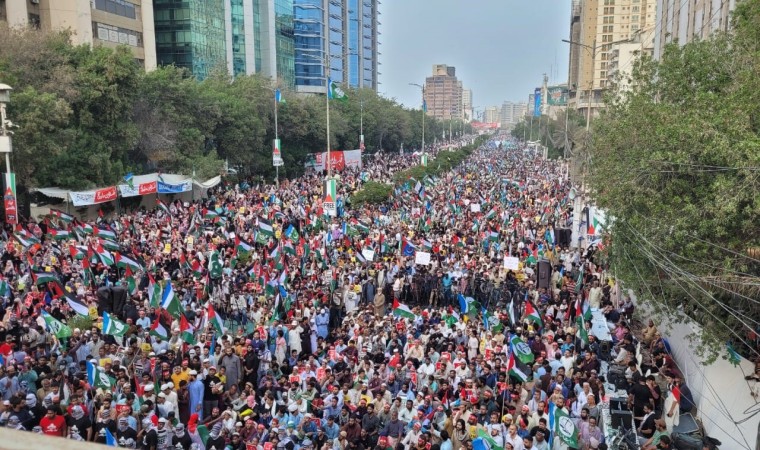 İsrail’in Gazze Şeridi’ne yönelik saldırıları 100’üncü günde devam ederken, Pakistan’ın Karaçi kentinde on binlerce kişi Filistin’e destek gösterisi düzenledi. Cemaat-i İslami (JI) Partisi tarafından organize edilen gösteriye çok sayıda kadın ve çocukta destek verdi. Ellerinde Filistin bayrakları bulunan göstericiler, İsrail’in Gazze Şeridi’ne yönelik devam eden saldırılarını kınayarak, saldırıların derhal durdurulması ve Müslüman liderlere Filistin konusunda birlik olmaları çağrısında bulundu.