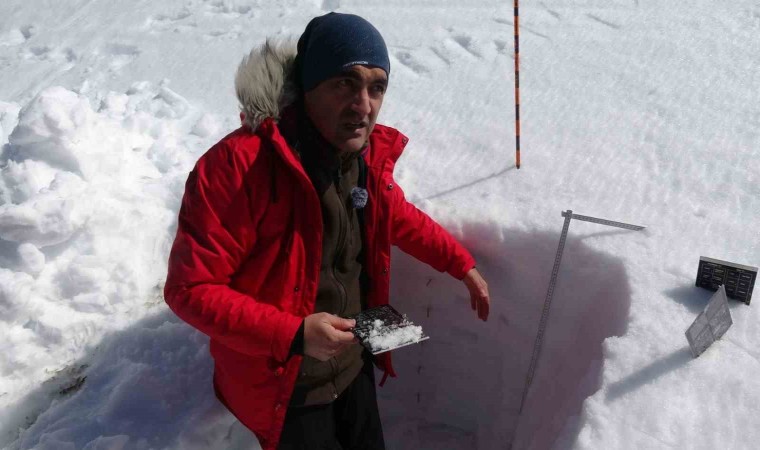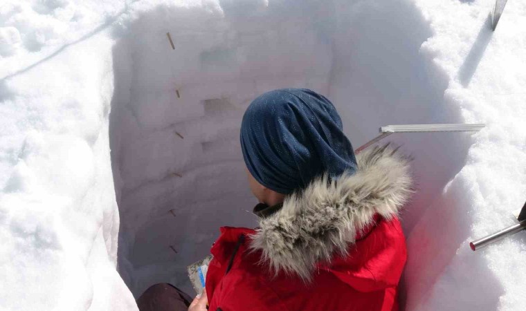 Erzurum Teknik Üniversitesi Mühendislik ve Mimarlık Fakültesi İnşaat Mühendisliği Bölümü’nden Dr. Öğretim Üyesi M. Cansaran Ertaş, yaklaşık 2 metrelik bir çukurda inceleme yaptıklarını ifade ederek, “Burada yaptığımız çalışmada karın katmanları belirleniyor. Bu katmanların fiziksel karakteristiklerinin ne kadar değiştiğini, ne kadar değişkenlik gösterdiğini tespit ediyoruz. Kar tanecik tipinin boyutunun nasıl farklılaştığını analiz edip değerlendiriyoruz. Bu noktada çok kıymetli sonuçlar elde ediyoruz. Aslında biz burada çığ analizi için zayıf katmanlarımızı belirliyoruz. Bu bizim için oldukça kritik. Kar örtüsünün nereden kopup gelebileceğini belirliyoruz. Burada 1,5 metreden fazla, 2 metreye yakın kar örtüsü bulunmakta ve burada 8-9 katmanlı bir kar örtüsünü olduğunu tespit ettik. Bunların da özellikle alt tarafta kar erimesinin başladığını gözlemleyebildik, değerlendirdik. Kar erime zamanını belirlemek, tahmin etmek kar fiziğinde oldukça önemli" şeklinde konuştu.