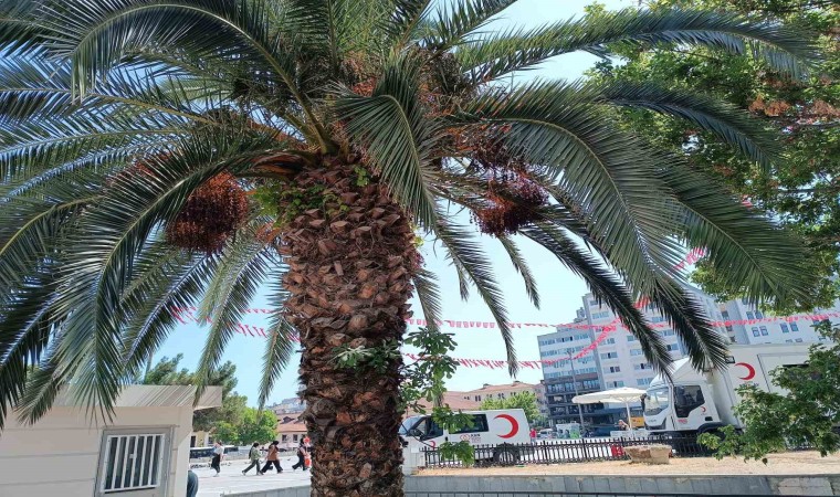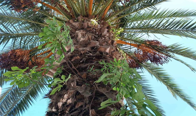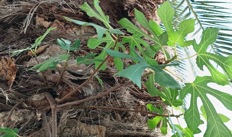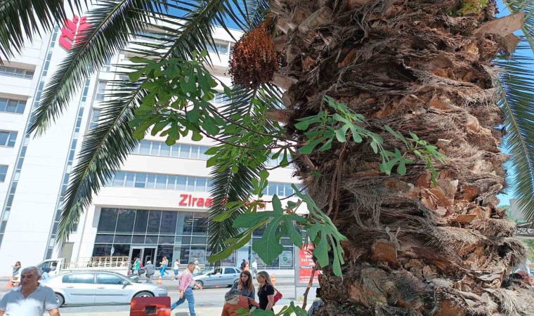 Samsun’da palmiye ağacının gövdesinde büyüyen incir fidanı, görenlerin dikkatini çekiyor.
