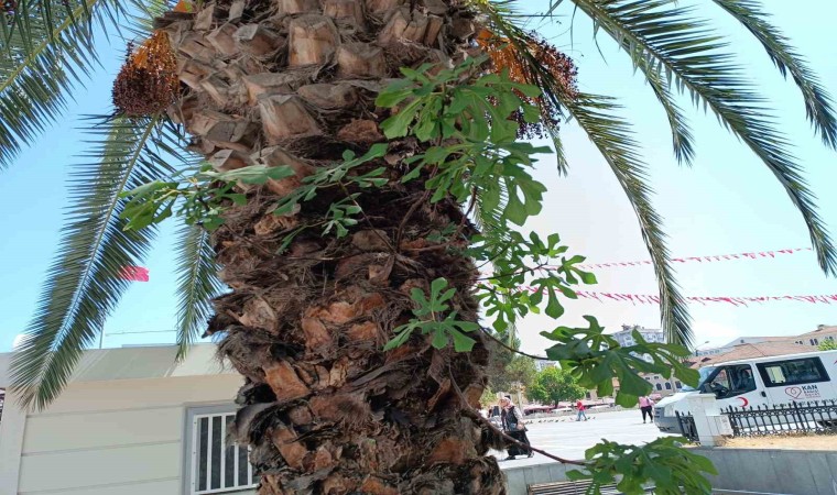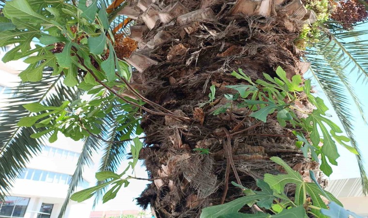 Vatandaşlar, palmiye ağacının gövdesinde büyüyen incir fidanının akıbetini merak ediyor.
