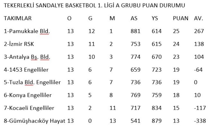 Pamukkale Belediyespor Kulübü’nün tekerlekli sandalye basketbol takımı ilk kez mücadele ettiği Tekerlekli Sandalye Basketbol 1. Ligi A Grubu’nda bitime bir hafta kala play-offa lider olarak çıkmayı garantiledi. Ligdeki son maçını bu hafta Tuzlaspor ile yapacak olan mavi-beyazlı takım yarı final biletini almak için Amedspor ile 9-16 Mart tarihinde iki maç oynayacak.