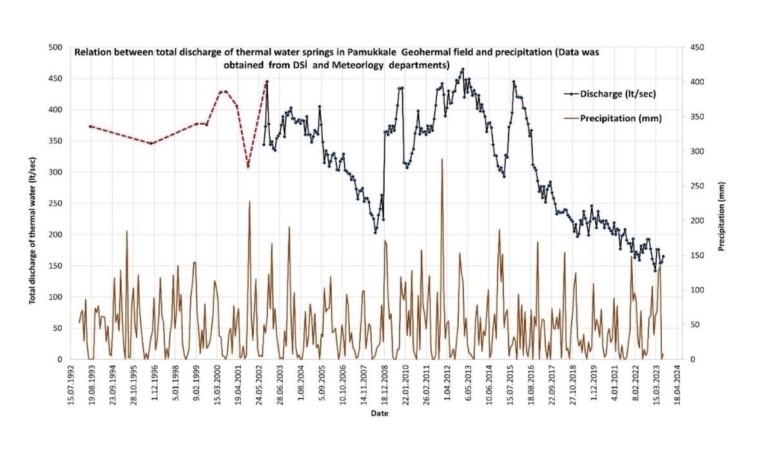 1993 yılında Pamukkale Jeotermal Sistemindeki termal su kaynaklarının toplam debisi saniyede 450 litre olarak ölçülürken, günümüzde ise saniyede 150 litrelere kadar düştüğü belirlendi. Su kaynaklarındaki azalmanın ise birkaç nedeni olduğunu belirten uzmanlar, jeotermal enerji üretim tesislerinin çoğalması, tarımsal sulama ve bölgedeki işletmelerin temel etken olduğunu ifade etti.