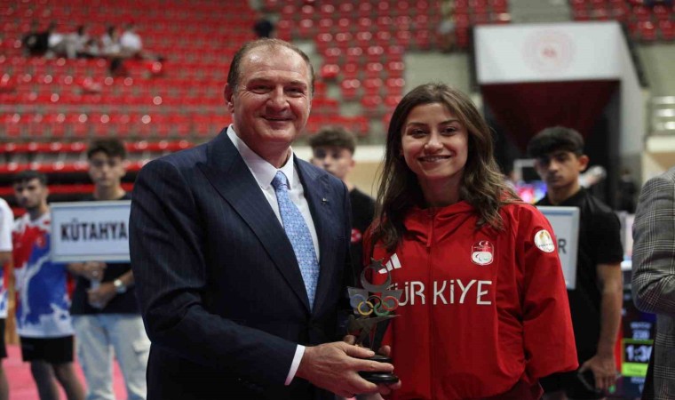 Türkiye Ümitler Tekvando Şampiyonası’na katılarak sporcular ile vakit geçiren Gamze Gürdal ve Ali Can Özcan’a Türkiye Tekvando Federasyonu Başkanı Metin Şahin tarafından plaket verildi.