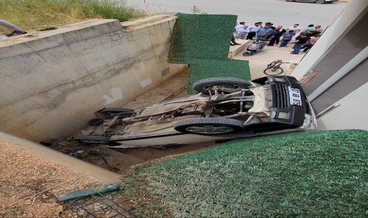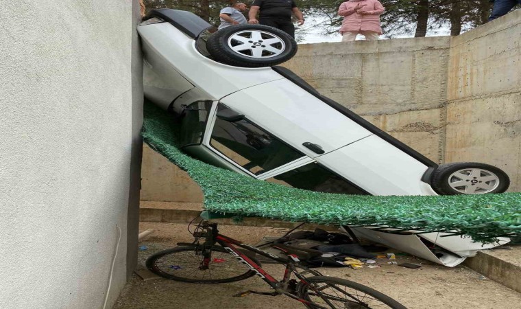Burdur’un Bucak ilçesinde sürücüsünün park ederken el frenini çekmeyi unuttuğu otomobil kayarak 5 metre yükseklikten düşüp iki duvar arasına sıkıştı.