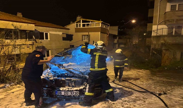 Olay gece saatlerinde ilçeye bağlı Merkez Mahallesi Truva Sokak mevkisinde meydana geldi. M.T.’ye ait 06 DU 3730 plakalı Mercedes marka otomobil henüz bilinmeyen bir sebeple alev aldı. Büyüyen yangını fark eden çevre sakinleri durumu ekiplere haber verdi.