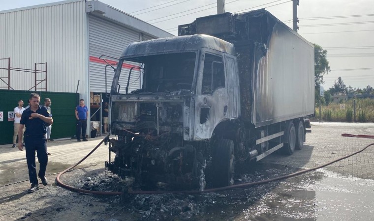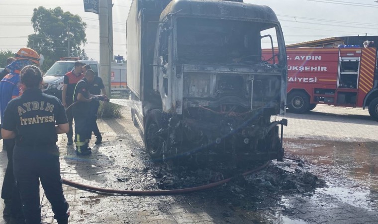 Aydın’ın Efeler ilçesinde park halinde bulunan tır alev alarak yanarken, kısa sürede tamamen yanarak kullanılamaz hale geldi.