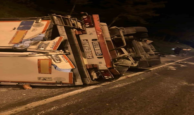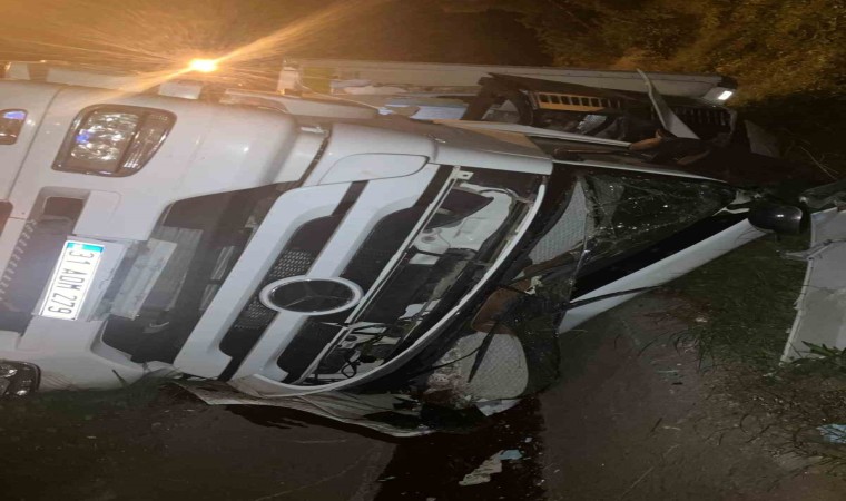 Hatay’da park halindeyken freni boşalan tır şarampole devrildi. Kazada tırdan yola nar döküldü.
