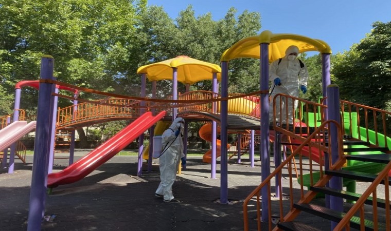 Melikgazi Belediye Başkanı Doç. Dr. Mustafa Palancıoğlu, çocukların daha steril alanlarda, güvenle oyun oynamaları için, parklardaki oyun alanlarının dezenfekte edildiğini söyledi.