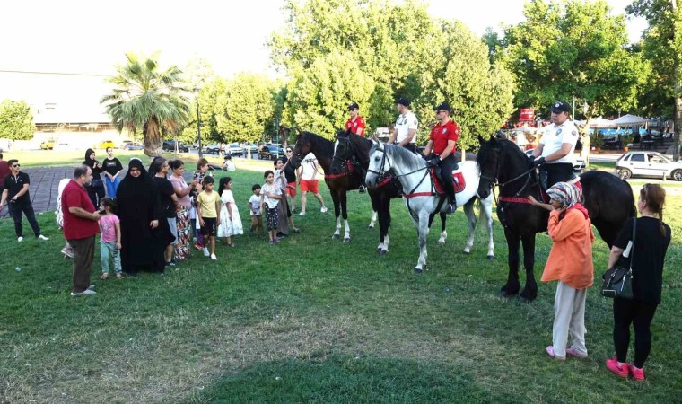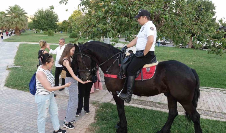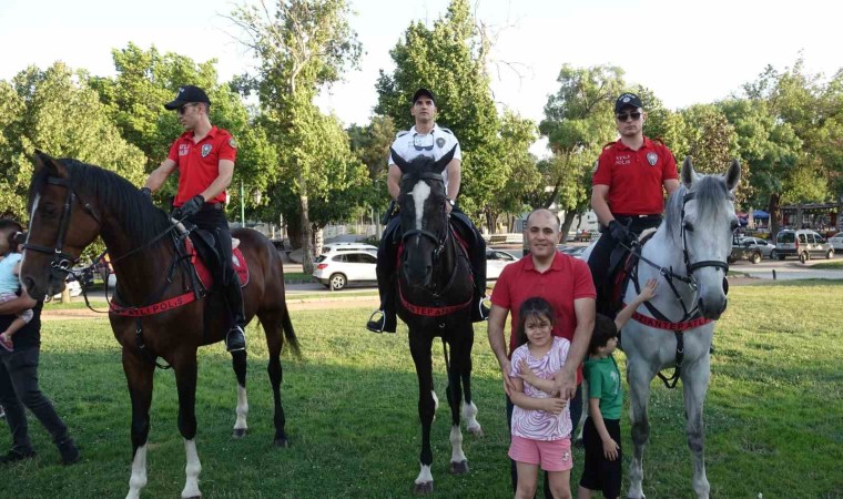 Aşırı sıcak nedeniyle vatandaşların tercih ettiği park, bahçe ve mesire alanlarında da devriye görevi yürüten atlı polisler, başta çocuklar olmak üzere kendilerine yoğun ilgi gösteren vatandaşlarla hatıra fotoğrafı çektiriyor.
