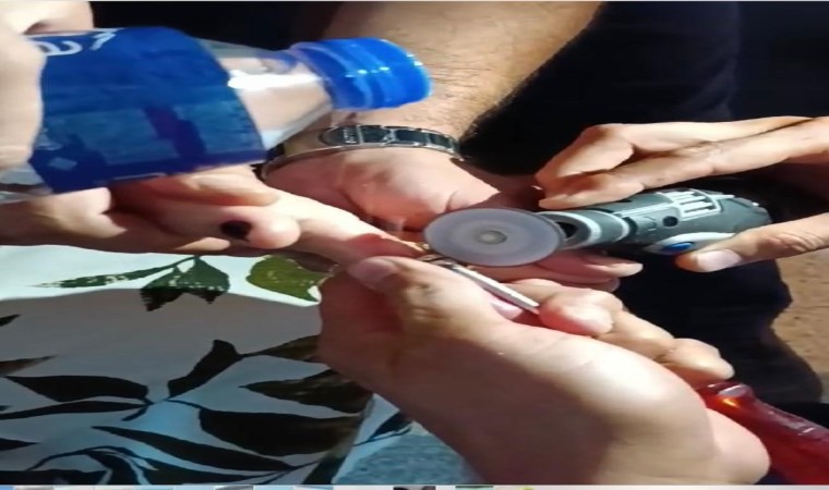 Hatay’ın Defne ilçesinde bir vatandaşın parmağına sıkışan yüzük, itfaiye ekiplerinin titiz çalışmasıyla çıkarıldı.