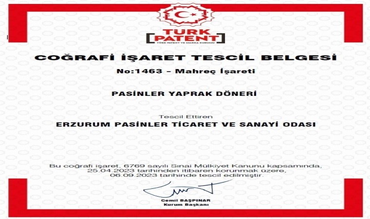Erzurum’un Pasinler Ticaret ve Sanayi Odası tarafından Pasinler Yaprak Döneri, tescil edilerek coğrafi işaret tescil belgesi aldı. Pasinler Yaprak Döneri Türk Patent ve Marka Kurumu tarafından 6769 sayılı Sınai Mülkiyet Kanunu kapsamında 24 Nisan 2023 tarihinden itibaren korunmak üzere 6 Eylül 2023 tarihi itibariyle tescil edildi. Pasinler Ticaret ve Sanayi Odası Yönetim Kurulu Başkanı Aydın Taşbaşı, Pasinler Yaprak Döneri’nin tescil edilmesinin ilçenin tanıtımı için önemli olduğunu söyledi. Başkan Taşbaşı, “Pasinler Yaprak Döneri odun ateşinde pişer. Eti yöremizin meralarında yetişen kuzulardan elde edilir. Damakta öyle bir tat bırakır ki, bir tadan bir daha tatmak ister. İlçemizin Hasankale lavaşını da geçtiğimiz günlerde tescil ettirmiştik.” dedi. Pasinler Ticaret ve Sanayi Odası tarafından 22.10.2019 tarihinde başvurusu yapılan dosya numarası C2019/153 olan Erzurum Hasankale Lavaşı 22.10.2019 tarihinden itibaren korunmak üzere 04.02.2022 tarihinde tescil edilerek Coğrafi İşareti Tescil Belgesi aldı.