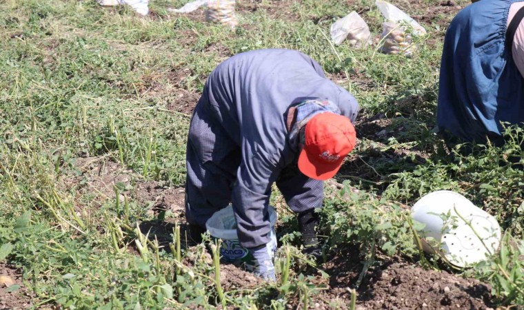 Sıcak havada patates toplayan işçilerden Emine Saltan, “Sıcak havada patates toplaması zor olmaz mı? Kırmızı şapkayla yüzümün rengi aynı oldu, zor” şeklinde konuştu.