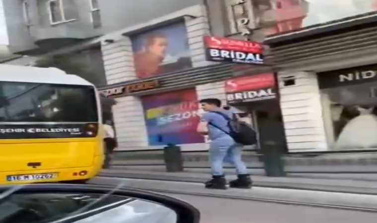 Bursa’da akan trafikte yolcu minibüsünün arkasına tutunarak ilerleyen patenli genç, hem kendi canını hem de diğer sürücüleri riske attı. O anlar kameraya anbean yansıdı.