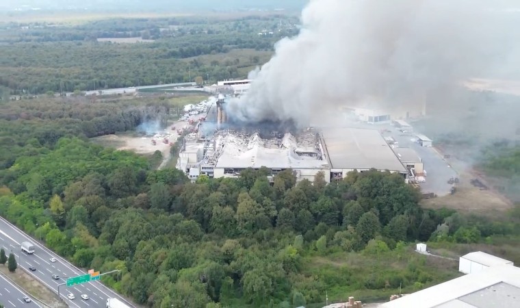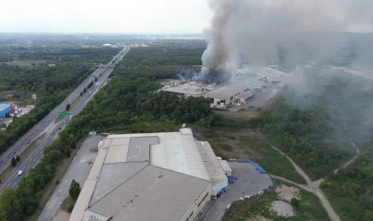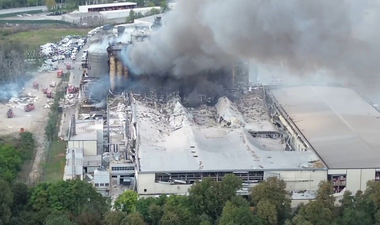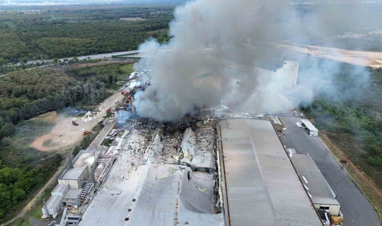 Sakarya’nın Hendek ilçesinde patlamanın ardından yangının çıktığı Oba Makarna fabrikası havadan görüntülendi.