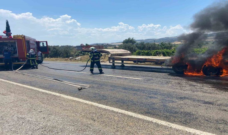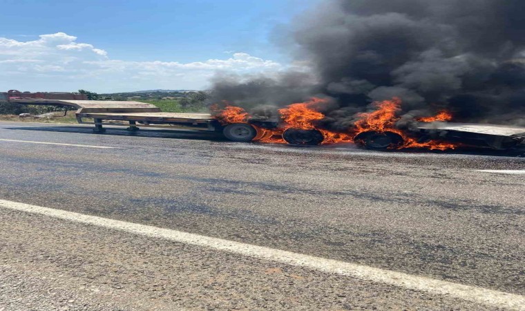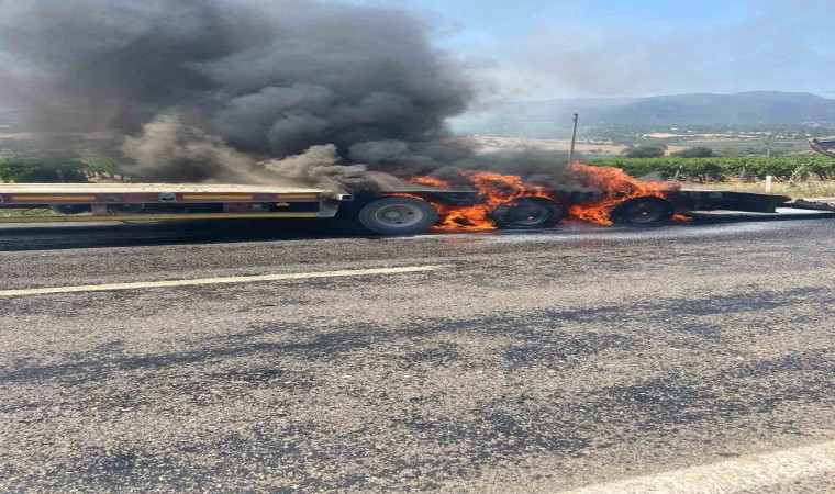 Denizli’de hareket halindeki tırın dorse lastiği patladı. Yüksek sıcaklık nedeniyle asfaltın tutuşmasıyla başlayan yangın, tırın lastikleri ve dorsesini alevler içinde bıraktı.