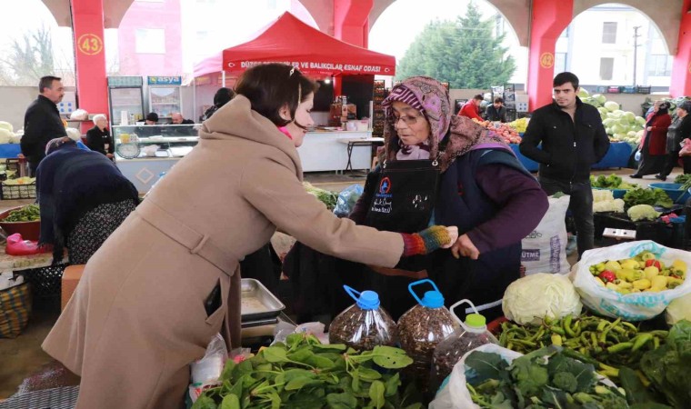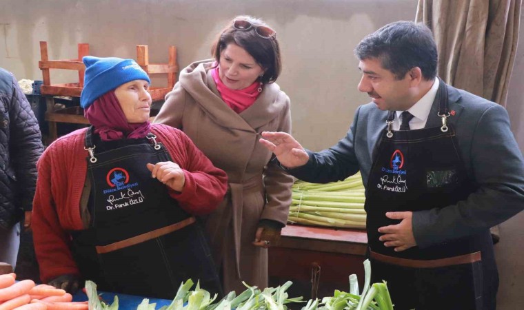 Düzce Belediye Başkan Yardımcısı Hasan Günden, beraberinde BelKA A.Ş. Genel Müdürü Necla Erdoğan, Sebze ve Balıkçılar Esnaf Odası Başkanı İslam Batuhan Yangaz ile birlikte Aziziye Merkez Pazaryerini ziyaret ederek, pazarcı esnafı ile bir araya geldi. Perşembe pazarında tezgah açan esnaflarla ayak üstü sohbet gerçekleştiren, istek ve taleplerini dinleyen Başkan Yardımcısı Günden, Belediye Başkanı Faruk Özlü’nün pazarcı esnafına hediye olarak gönderdiği önlükleri de tek tek takdim etti. Başkan Özlü’nün selamlarını ve ‘hayırlı işler’ temennilerini de esnaf ile paylaşan Günden, pazarcı tezgahlarına konuk olarak samimi sohbet gerçekleştirmeyi de ihmal etmedi. Pazaryeri esnafları da kendilerine gösterdikleri incelikten ve hediyelerinden ötürü Başkan Faruk Özlü’ye teşekkürlerini iletti.