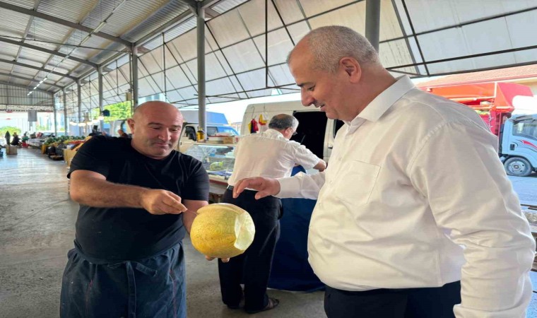 Başkan yılmaz Yıldız, ilçede Salı gnü kurulan Pazar yerinde pazarcı esnafı ile bir araya geldi. Yıldız’a pazarcılar kavun ikram edilirken “Sıcak, soğuk demeden meyve, sebzenin en tazesini vatandaşlarımızla buluşturmak için emek veren pazarcı esnafımıza hayırlı ve bereketli kazançlar diliyorum” dedi.