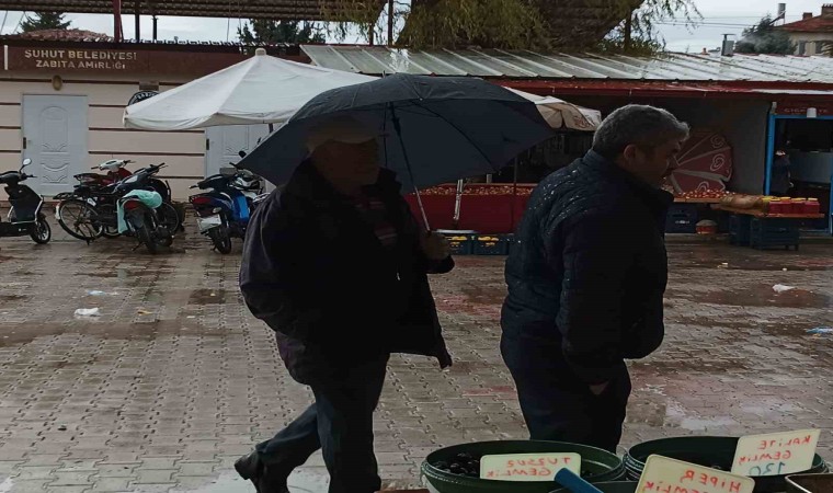 Şuhut ilçesinde hafta sonları kurulan semt pazarında bir çok esnaf olumsuz hava şartlarından dolayı zor anlar yaşadı. Sağanak yağış ile birlikte şiddetli rüzgar yüzünden esnaflar şemsiye ve tentelerinin uçmaması için yoğun çaba gösterdi. Yağmurdan sattıkları ürünleri koruma isteyen bazı esnaflar ise alışverişin devam ettiği en yoğun saatlerde tezgahlarını toplayarak evlerinin yolunu tuttu. Olumsuz hava koşulları ilçede devam ediyor.