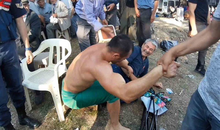 Bu esnada baş güreşçi, yanlışlıkla orada seyirci olarak oturan vatandaşın ayağına tuttu. Rakibi sandığı vatandaşla güreşmeye çalışan baş güreşçi, vatandaşı yere serdi. Şimşir Bayramı’nda bulunan vatandaşlar da bu anlarda kahkahaya boğuldu.