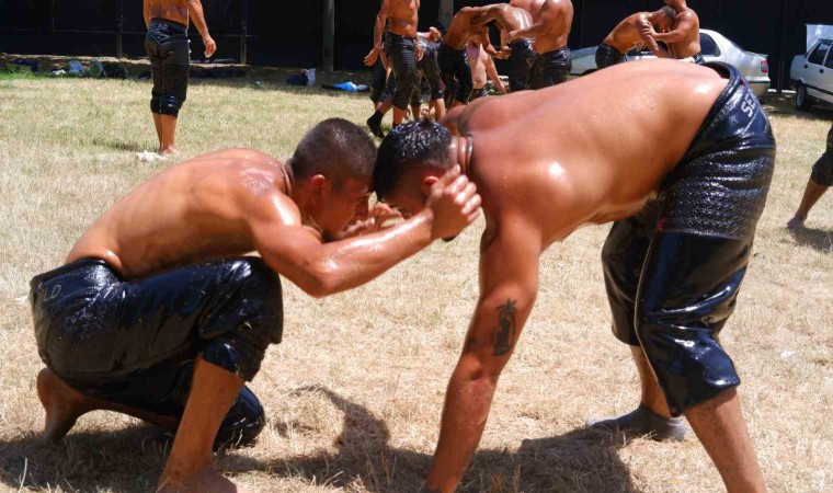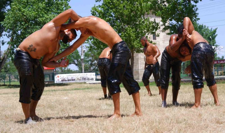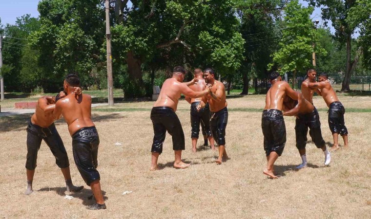 Hava sıcaklığının yaklaşık 40 dereceye yükseldiği Edirne’de, Kırkpınar’da kürsüye çıkabilmek için taktik ve dayanıklılık çalışması gerçekleştiren pehlivanlar, yağlı antrenmanlarına devam ediyor.