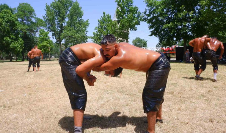 Edirneli pehlivanlar, 663. Tarihi Kırkpınar Yağlı Güreşleri’ne hazırlık için 40 derece sıcaklığa rağmen kispet bağlayıp çayıra çıktı. Koşu ve ısınma hareketlerinin ardından birbirleriyle eşleşip sıcak hava altında güreş tutan pehlivanlar, şimdiden nefes kesti.