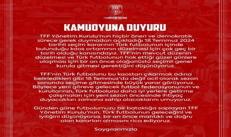 "TFF Yönetim Kurulu’nun hiçbir öneri ve demokratik sürece gerek duymadan açıkladığı 18 Temmuz 2024 tarihli seçim kararının Türk futbolunun içinde bulunduğu kaos ortamının düzelmesi için çok geç bir tarih olduğu kanısındayız. TFF’nin mevcut düzenin düzelmesi ve Türk futbolunun hak ettiği güzel günlere ulaşması için bir an önce olağanüstü seçimli genel kurula gitmesi gerektiğini düşünüyoruz.