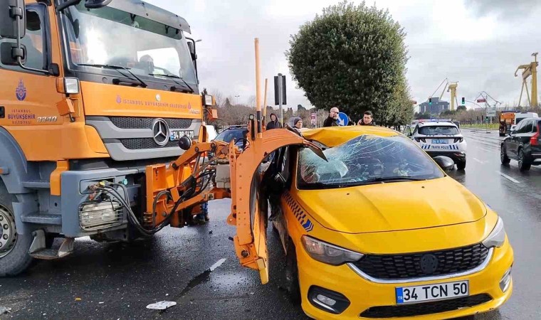 Pendik’te İstanbul Büyükşehir Belediyesi’ne ait kar küreme aracı kırmızı ışıkta geçen ticari taksiye çarptı. Kazada ticari taksi kullanılamaz hale gelirken, takside bulunan 3 kişi yaralandı.