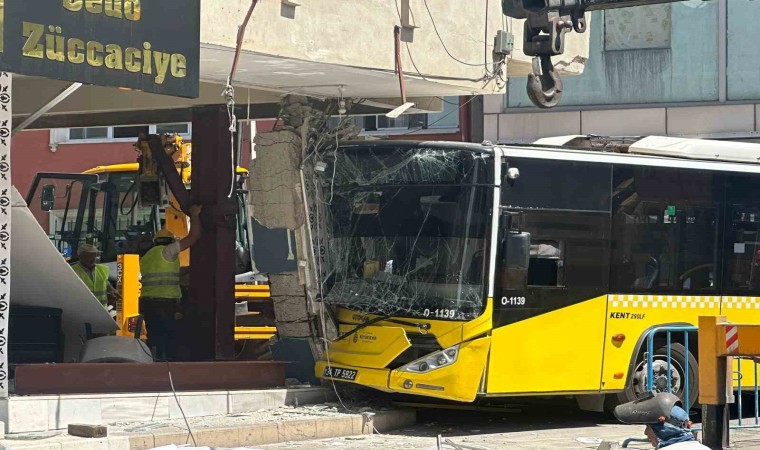 İETT otobüsünün çarptığı binanın kolonunda oluşan ağır hasar nedeniyle bina tahliye edilirken, otobüsü vinç yardımıyla olay yerinden kaldırmak için binada güçlendirme çalışmalar devam ediyor.