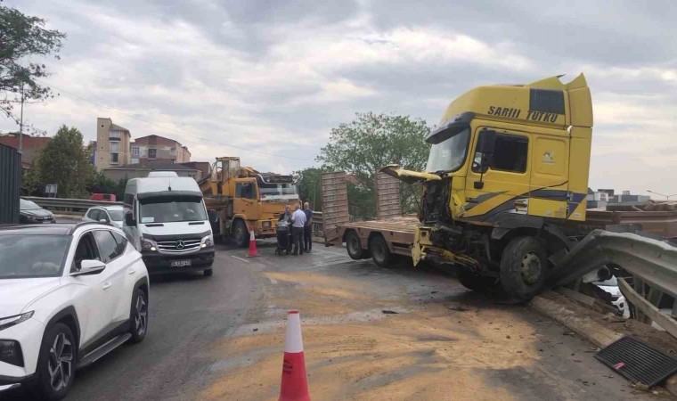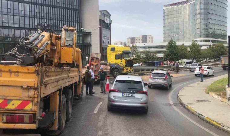 Pendik’te sürücüsünün direksiyon hakimiyetini kaybetmesi sonucu kaza yapan tır bariyerlerde asılı kaldı.