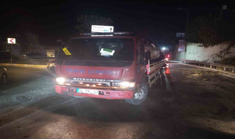 Pendik’te bir otomobil, sürücüsünün direksiyon hakimiyetini kaybetmesiyle bariyerleri aşarak caddeye devrildi.