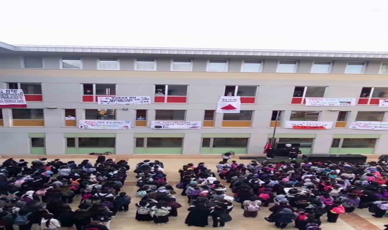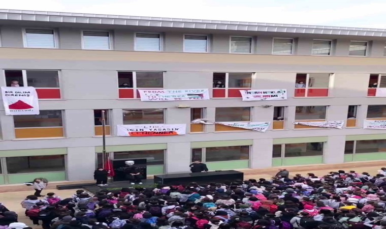 Pendik’te bulunan bir imam hatip lisesinin öğrencileri, İsrail’in Filistin’e karşı katliamlarını protesto etmek için okulun pencerelerine pankart astı, hep bir ağızdan ezgi söyledi.