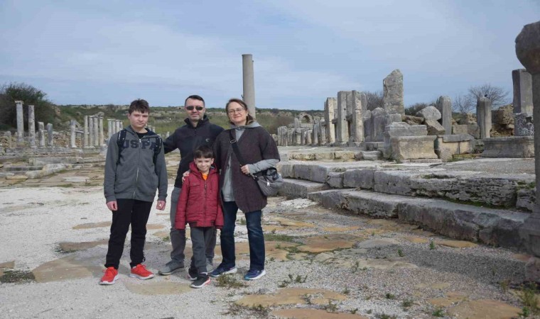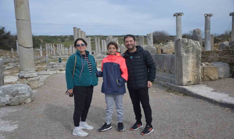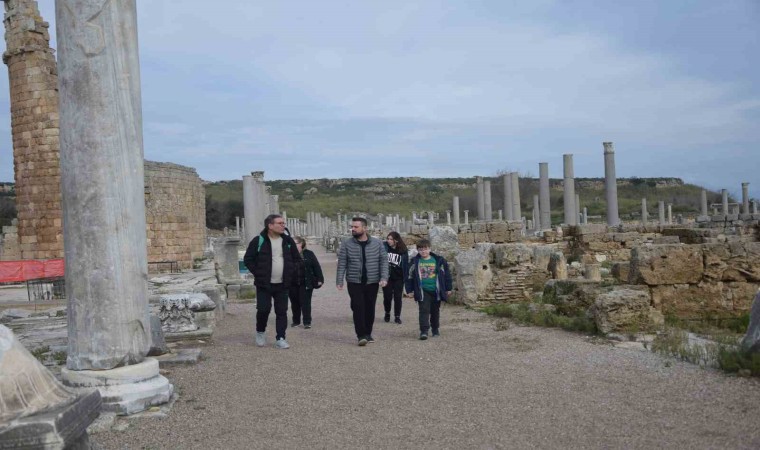 Yarıyıl tatilinin yaşandığı şu günlerde, hava durumunun mevsim normallerinin üzerinde seyretmesi nedeniyle diğer illerden gelen aileler, çocuklarıyla Perge Antik Kenti’ni baştan sona gezme fırsatı buluyor.