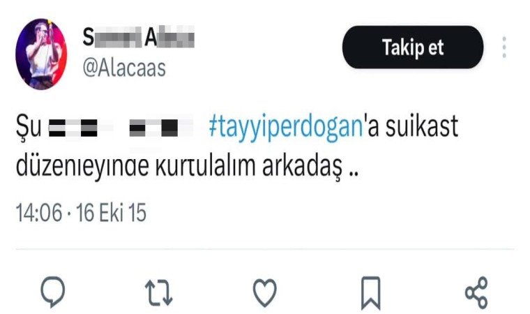 Zanlı geçmiş yıllara ait paylaşımlarında dini değerlere hakaret edip, Cumhurbaşkanına suikast çağrısı yapmış.