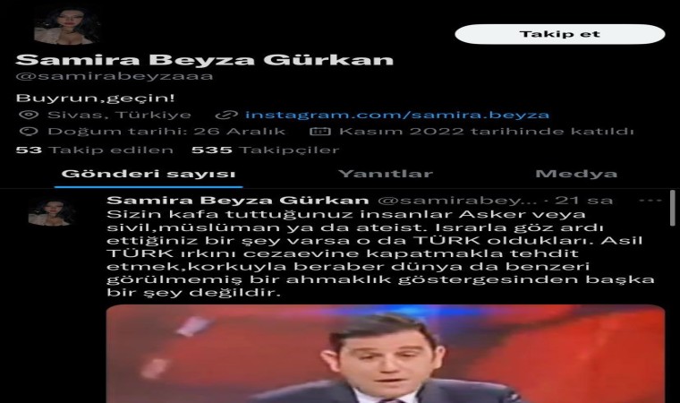 Sivas’ta yaklaşık 6 ay önce sosyal medya hesapları üzerinden Peygamber Efendimize, dini değerlere ve devlet büyüklerine hakaret eden, 29 ayrı suç kaydı bulunan Beyza Gürkan (22), çıkartıldığı mahkemece paylaşımları kendisinin yapmadığını iddia etse de 10 ay hapis cezasına çarptırılmıştı. Ev hapsi süren Gürkan bu kez de Ümit Özdağ’a destek veren paylaşımlarıyla dikkat çekti.