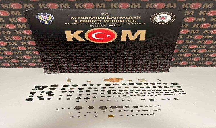 Afyonkarahisar’da polis tarafından durdurulan bir otomobilde yapılan aramada 175 adet tarihi sikke ile çeşitli objeler ele geçirildi.