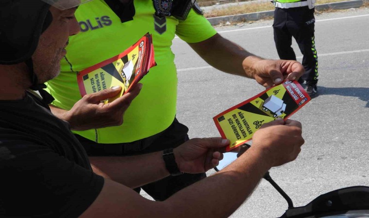 Motosiklet sürücülerine tırın kör noktalarını gösteren broşür dağıtan trafik polisleri, sürücülere bilgilendirme yaparak dikkatli olmaları istendi.