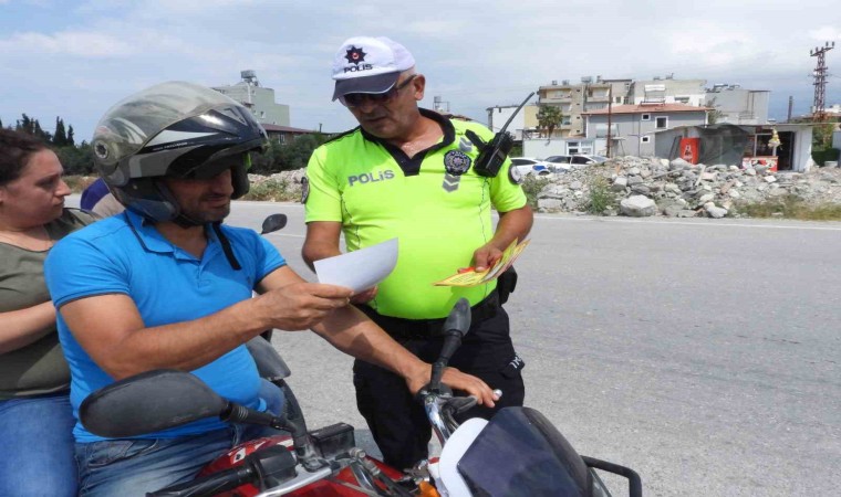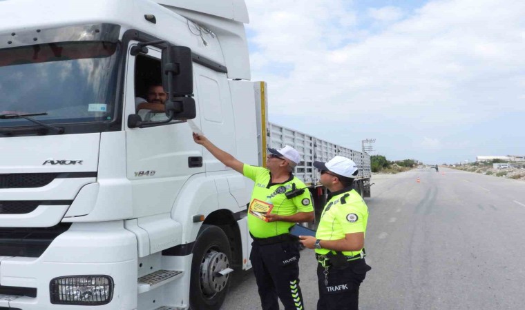 Hatay’ın Samandağ ilçesinde polsi ekipleri, tır ve motosiklet sürücülerine trafik kurullarına yönelik bilgilendirici broşür dağıttı. .