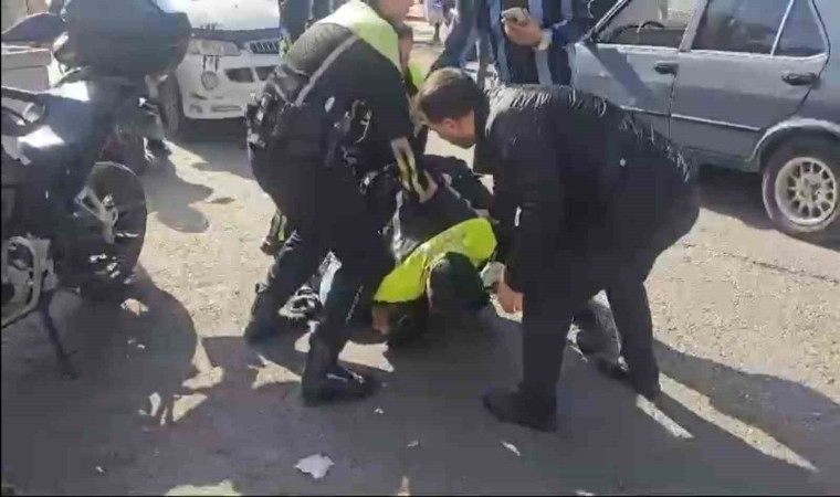 Polisler ile sürücü arasında tartışma yaşandı. Araya giren sürücünün kardeşi, cezanın iptal edilmesi için uzun süre dil döktü. Polislerin cezayı iptal etmeyeceğini anlayan sürücü mukavemette bulundu. Sürücüyü yere yatıran polisler biber gazıyla müdahale etti. Gözaltına alınan sürücü emniyete götürülürken yaşananlara sinirlenen kardeşi, otomobile tekme attı.