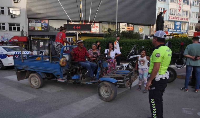 Edirne İl Emniyet Müdürlüğü ve Keşan İlçe Emniyet Müdürlüğü ekipleri tarafından Keşan genelinde, 150 personelin katılımıyla 7 ayrı noktada, dron destekli “Şok” uygulaması yapıldı. Keşan Kaymakamı Cemalettin Yılmaz, İl Emniyet Müdürü Onur Karaburun ve İlçe Emniyet Müdürü Mustafa Yalçın’ın da incelemelerde bulunduğu uygulama noktalarından biri olan Alparslan Türkeş Meydanı’nda üzerinde yetişkin ve çocuklar olmak üzere 9 kişinin bulunduğu tarım aracı durduruldu.
